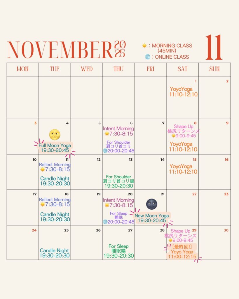 Yoga自分の肉体、心、呼吸と深く向き合うことを目指します。よりマットの上での気づきを得るために、ベーシックなポーズ中心で構成されます。ひとつひとつ、丁寧に動いていきましょう。